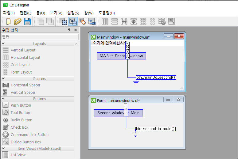 mainwindow에는 btn_main 버튼을, secondwindow에는 btn_second 버튼을 생성해두자.